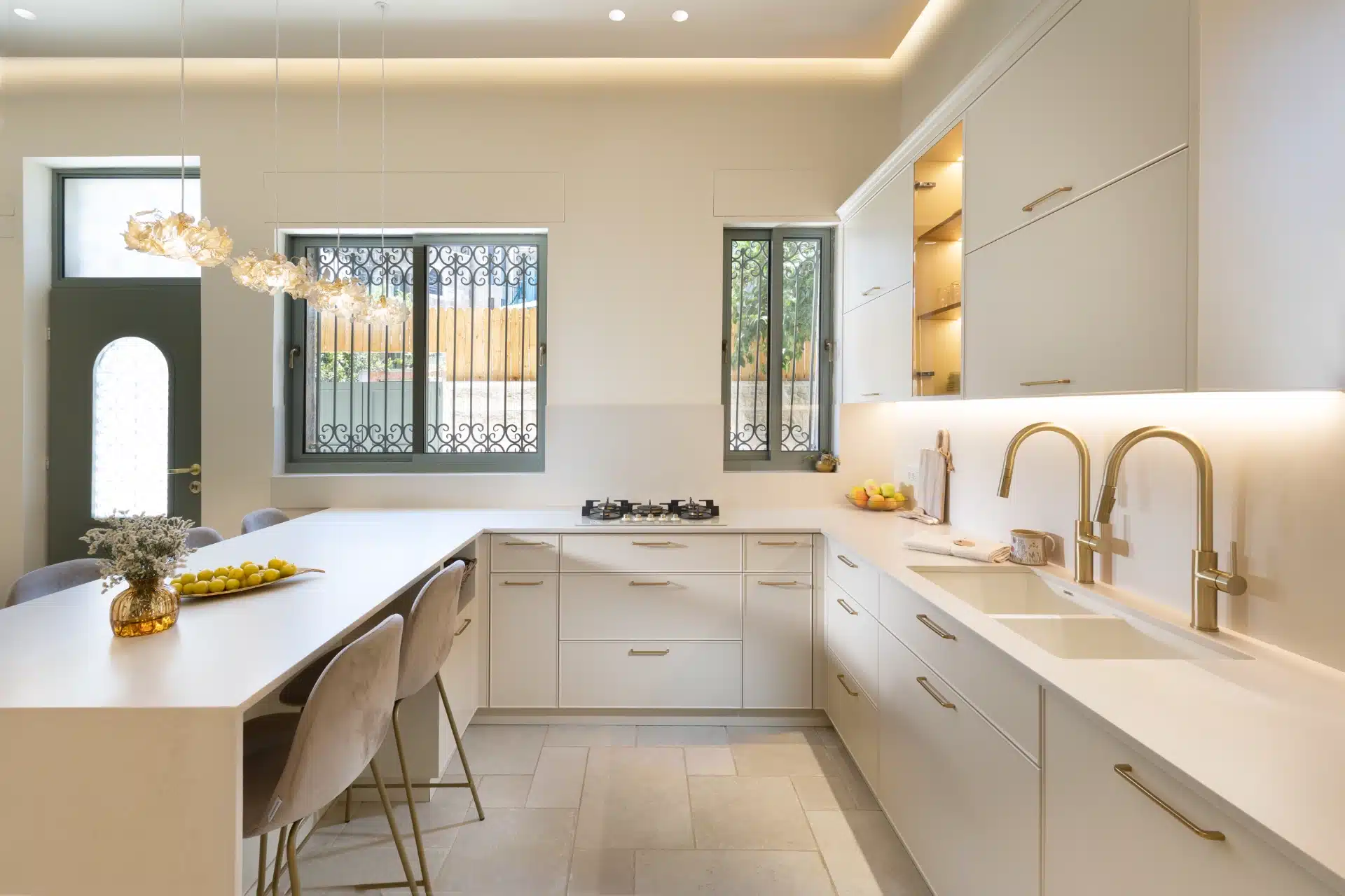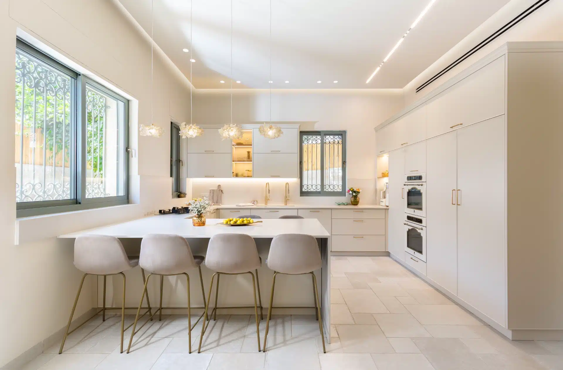 מטבח עם משטחי עבודה וחיפוי קירות ברמת גימור הגבוה ביותר שנעשו מאבן קיסר 5222 הפרויקט בעיצובה היצירתי והייחודי של "הדס דילהרוזה"